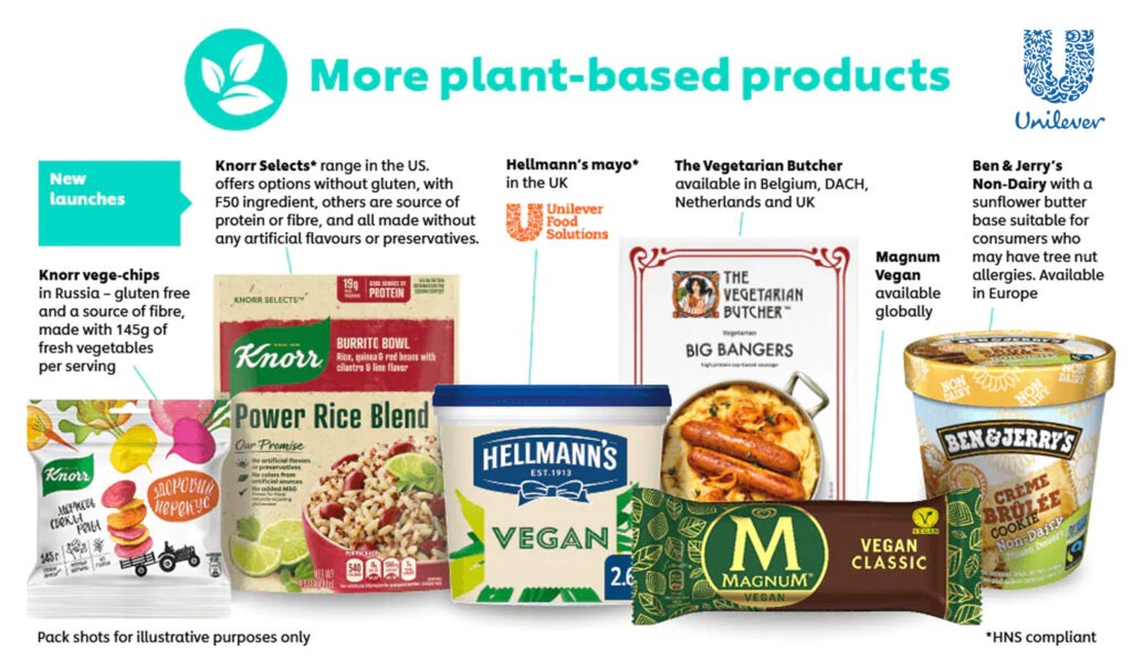 Επίσης, η εταιρεία η Unilever Food Solutions, προσφέρει φυτικά προϊόντα ώστε να ανταποκριθεί στη ζήτηση των καταναλωτών. Η Knorr Professional, για παράδειγμα, διαθέτει στην γκάμα της 100% φυσικών, πλήρων και ισορροπημένων μιγμάτων επανα-υδατωμένων σπόρων και λαχανικών, ώστε οι καταναλωτές να δημιουργούν με ευκολία συναρπαστικές και θρεπτικές συνταγές. Η Unilever Food Solutions βοηθά σεφ σε όλο τον κόσμο ώστε να προσφέρουν περισσότερες βίγκαν επιλογές στα μενού τους, παρέχοντας συνταγές, εργαστήρια και εκπαίδευση.